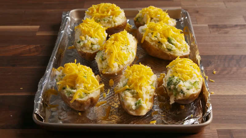 Μοιράστε τη γέμιση στο εσωτερικό τον 8 μισών πατατών και ρίξτε το υπόλοιπο cheddar.